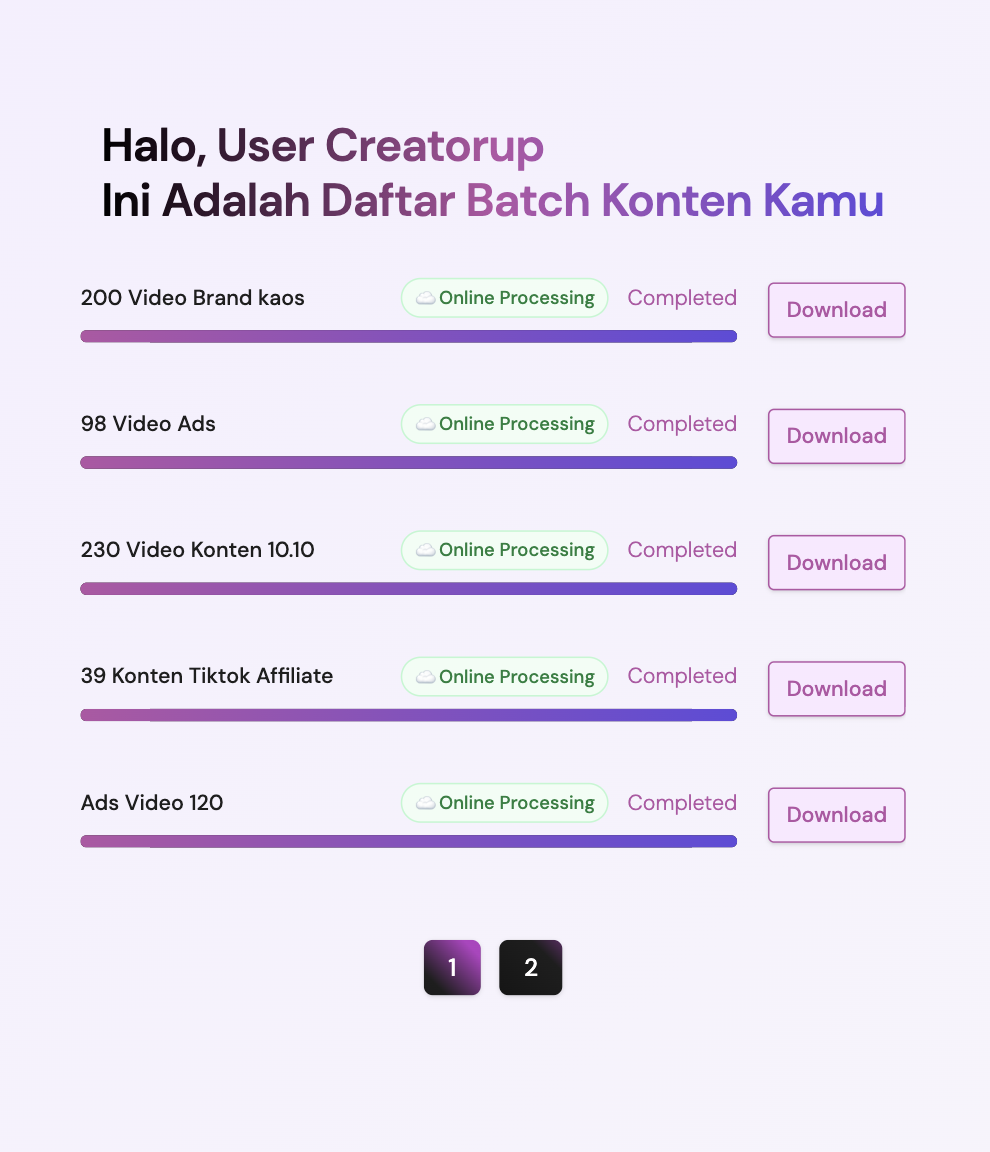 CreatorUp adalah platform berbasis AI yang membantu brand, bisnis, maupun individu dalam membuat ratusan konten unik dan berkualitas tinggi hanya dalam hitungan menit. Konten yang dihasilkan mencakup video, caption, hingga voiceover yang berbeda di setiap output sehingga tidak monoton atau terdeteksi sebagai duplikat.